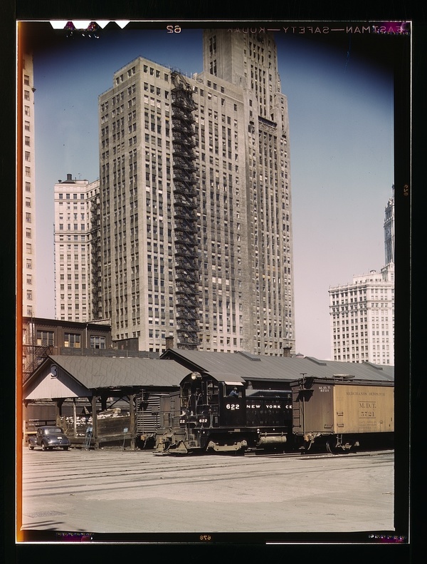 Diesel switch engine moving freight cars at the South water street freight terminal of the Illinois Central R.R., Chicago, Ill. The N.Y. Central is one of the railroads that lease terminal facilities from the I.C.R.R.