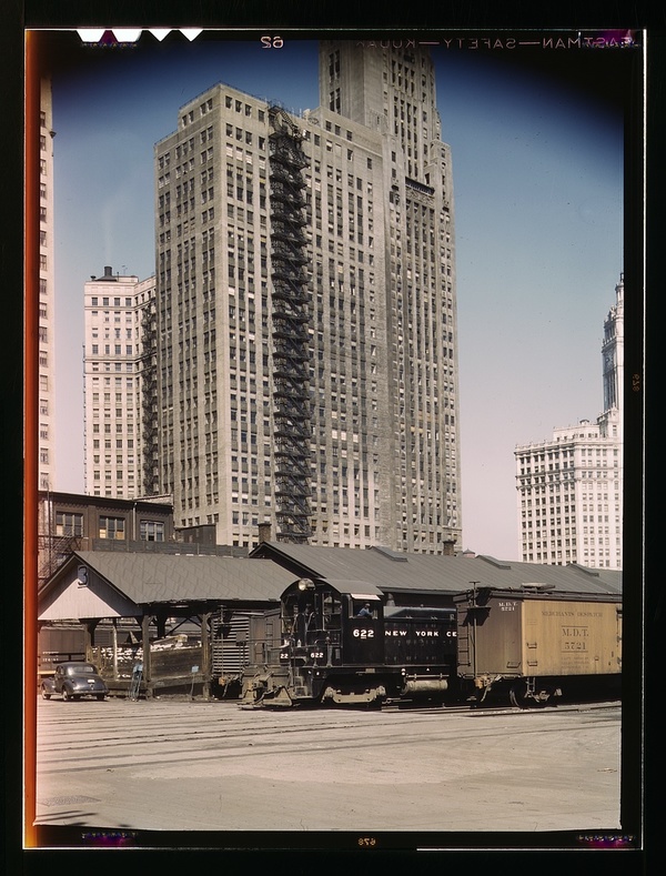 Diesel switch engineer moving freight cars at the South Water street freight terminal of the Illinois Central R.R., Chicago, Ill. The N.Y. Central is one of the railroads that lease terminal facilities from the I.C.R.R.