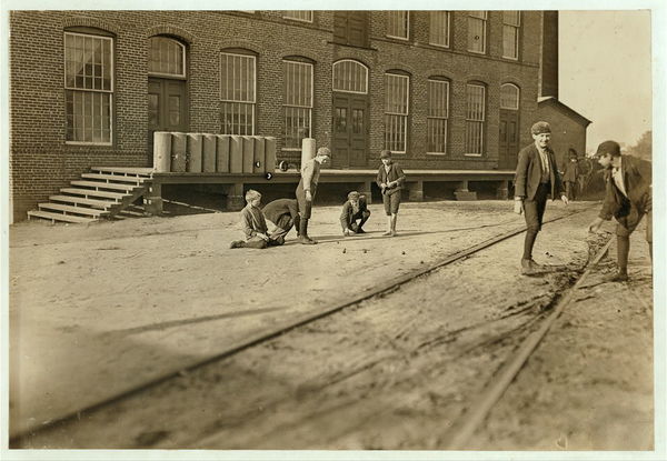 Doffer boys have lots of fun between times. (But get habits of irregular work.) This is the middle of the morning. Willingham Cotton Mills, Macon, Ga. Location: Macon, Georgia.