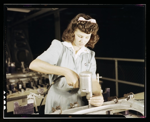 Drilling a wing bulkhead for a transport plane at the Consolidated Aircraft Corporation plant, Fort Worth, Texas