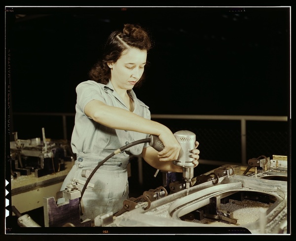 Drilling a wing bulkhead for a transport plane at the Consolidated Aircraft Corporation plant, Fort Worth, Texas