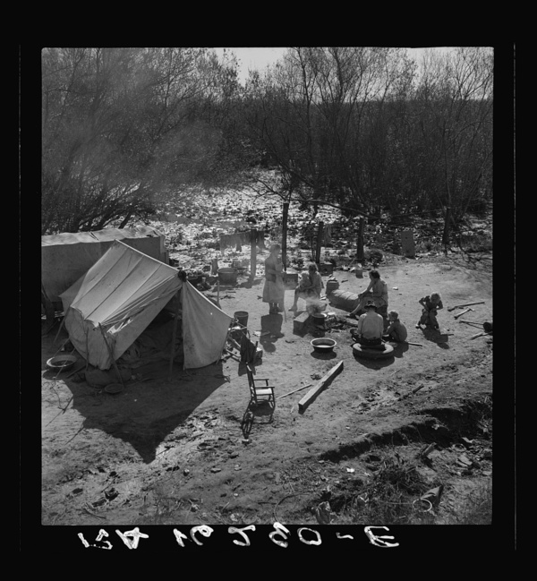 Drought refugees from Chickasaw, Oklahoma. Three families traveling together. They can't travel because of lack of money for trailer license. Near Santa Maria, California