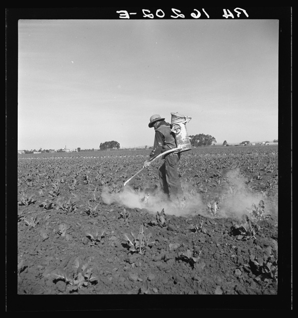 Dusting cauliflower plants near Santa Maria, California
