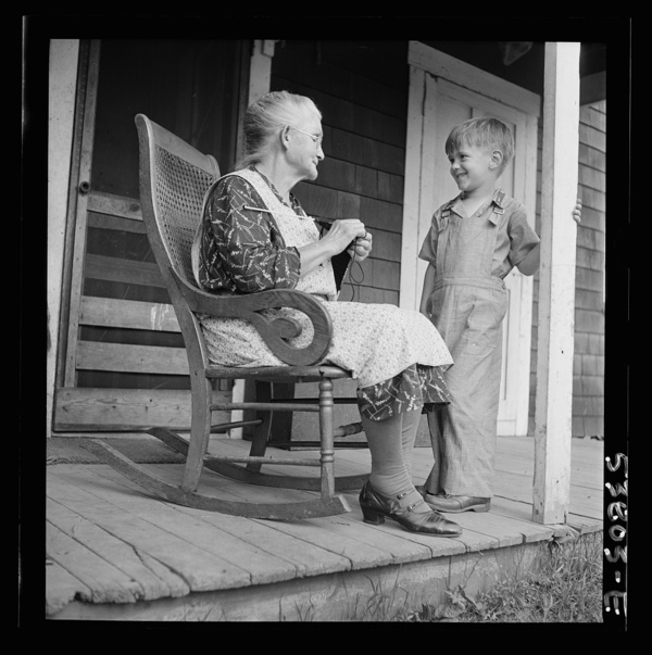 East Montpelier, Vermont. Charles Ormsbee's widowed mother, Mrs. Myrtle Ormsbee, knitting sweaters for the Red Cross, and entertaining her grandson of five at the same time