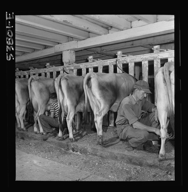 East Montpelier, Vermont. Milking time on Charles Ormsbee's farm. He and his son Conrad, age eleven, are using automatic milkers. Mr. Ormsbee agreed to increase his Jersey herd from twenty-five to thirty milkers, to aid in the Food for Freedom program