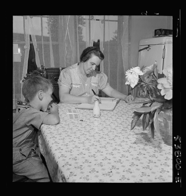 East Montpelier, Vermont. Richard, age five, son of Charles Ormsbee, shown with his mother, is licking savings stamps, a self-selected war project. All his family contribute in special ways to the war effort