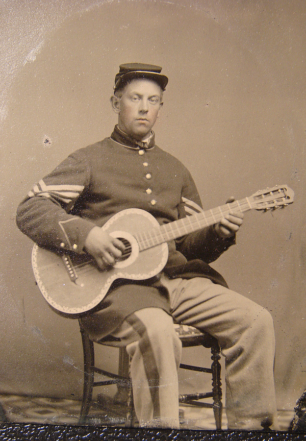 Edwin Chamberlain of Company G, 11th New Hampshire Infantry Regiment in sergeant's uniform with guitar