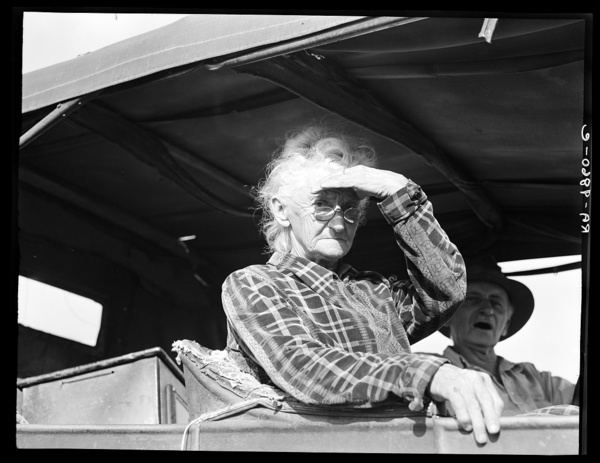 Grandmother of twenty-two children, from a farm in Oklahoma; eighty years old. Now living in camp on the outskirts of Bakersfield, California. "If you lose your pluck you lose the most there is in you - all you've got to live with"