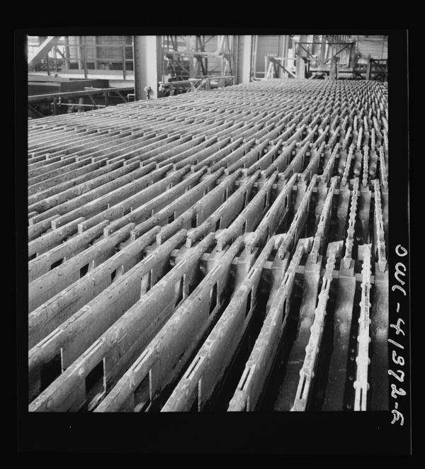 El Paso, Texas, Phelps Dodge refining company. Electrolytic tanks in which sheets of pure copper are formed. The sheets are later melted and cast into ingots