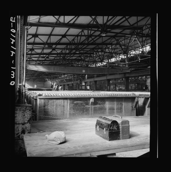 El Paso, Texas. Phelps Dodge refining company. Sheets of pure copper are formed by electrolysis in large tanks in later melted and poured into ingots