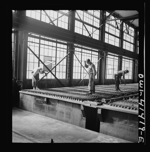 El Paso, Texas, Phelps Dodge refining company. Electrolytic tanks in which sheets of pure copper are formed. The sheets are later melted and cast into ingots