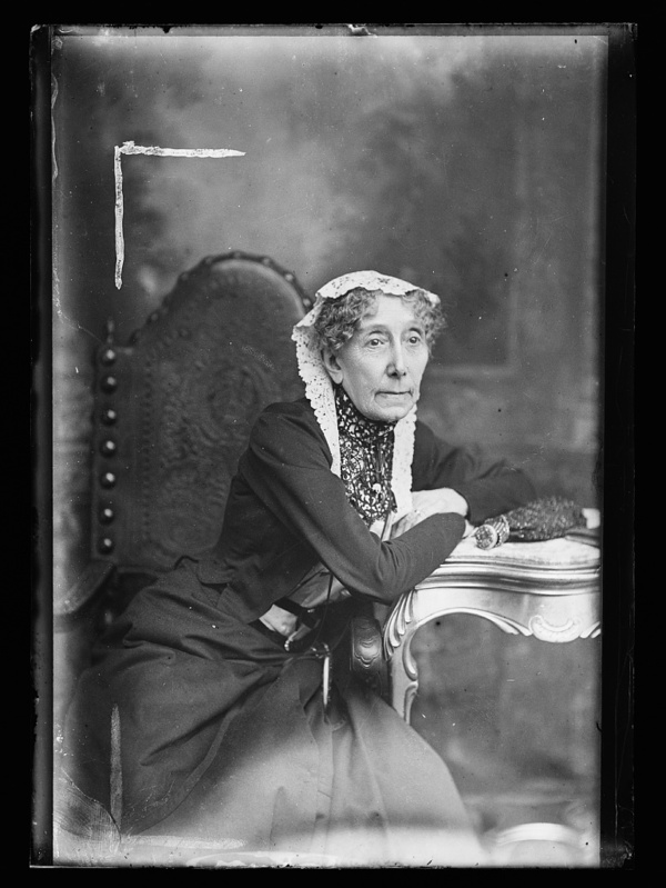 Elderly woman in lace cap leaning on table, three-quarter-length portrait