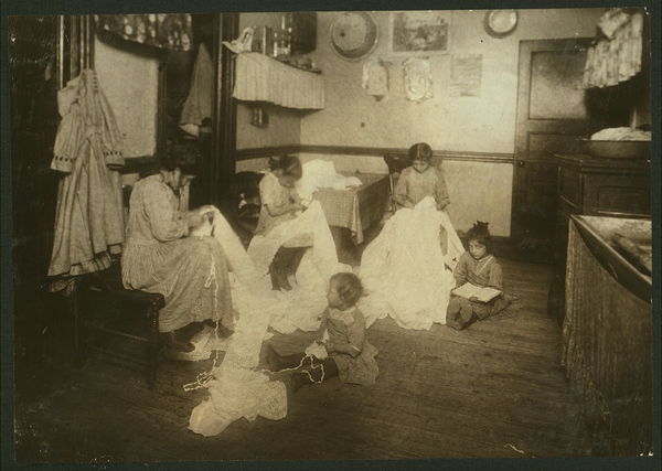 Embroidering chiffon waists in crowded bed-room, East Side. (For complete details see Miss E. C. Watson's report.) Location: New York, New York (State)