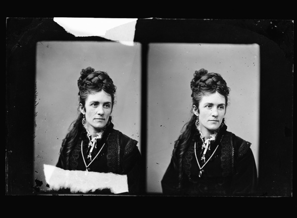 Girl, probably Hallie Jackson, in white dress posed against rock in studio background