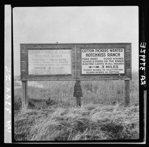 Employment signs in Spanish and English. These ranches (1938) increasingly use pickers. Near Fresno, California