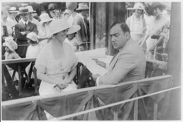 Enrico Caruso, 1873-1921, drawing caricature sketches in booth at charity fair in Southampton, L.I., with sitter, Mrs. Albert Gallatin