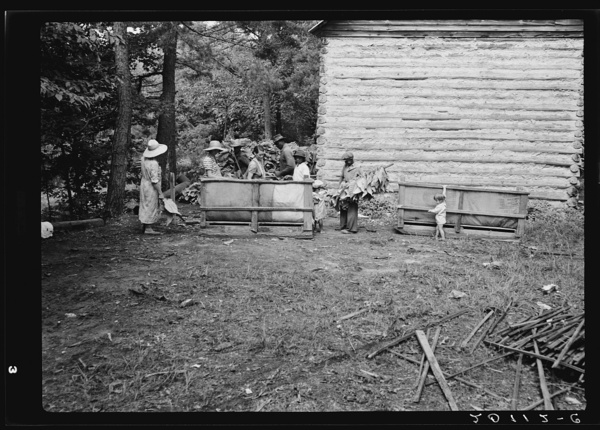 Families stringing tobacco brought in from the field by sled. Granville County, North Carolina