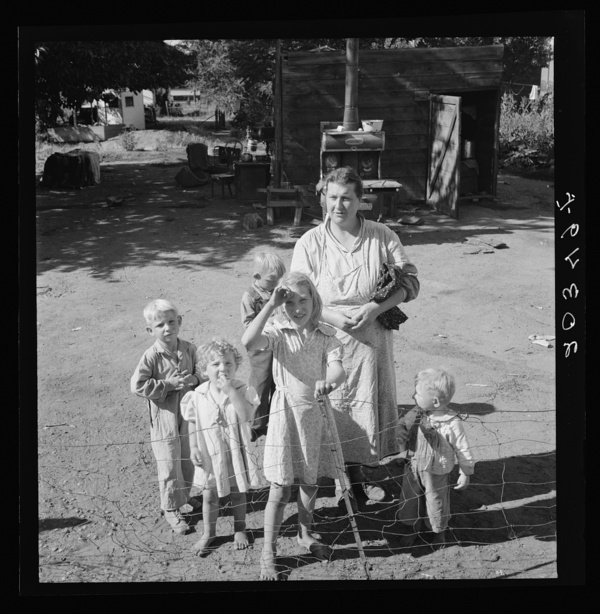Family living in shacktown community, mostly from Kansas and Missouri. This family has five children, oldest in third grade. Rent seven dollars per month, no plumbing. Husband working on Work Projects Administration wages, forty four dollars