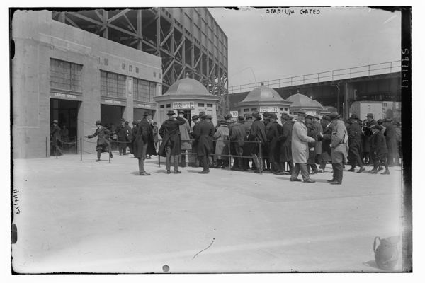 Fans at ticket booths at Yankee Stadium, right field grandstand (baseball)
