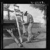 Small cotton farmer stays at the wagon and keeps acocunt of the weight of each sack brought in by pickers from the field. Kern County, California