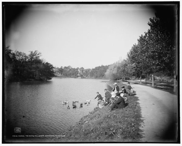 Feeding the ducks, Fellsmere reservoir, Malden, Mass.