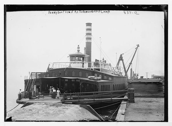 Consumptives dining on ferryboat, which is used as a tuberculosis camp