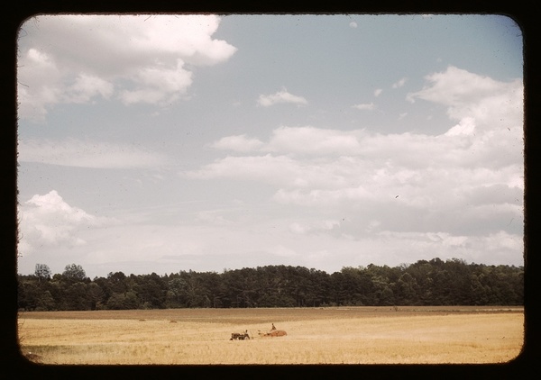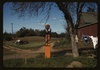 Gas pump with clothesline, barn and horse-drawn wagon in background