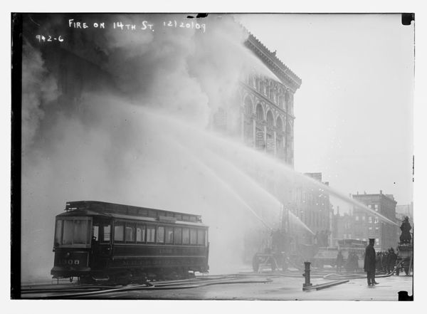 Firemen spraying burning building on 14th St., trolley in foreground, New York