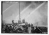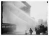 Firemen spraying burning building on 14th St., trolley in foreground, New York