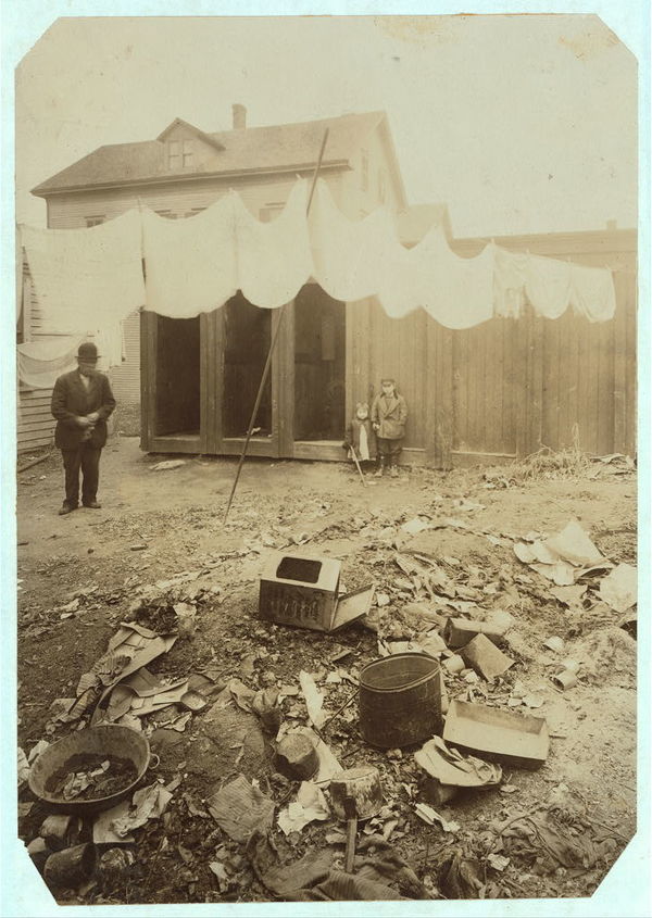 (For Child Welfare Exhibit 1912-13.) Back-yard and privies in terribly filthy condition, 76-78 Borden Street, Providence, R.I. Owners Wealthy. Location: Providence, Rhode Island.
