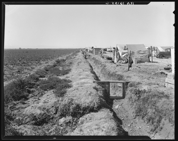 Forty families of drought and depression refugees camped by the roadside beside an irrigated pea field. A freeze which destroyed the pea crop threw practically every family in this camp on emergency relief. Nine miles from Calipatria, California