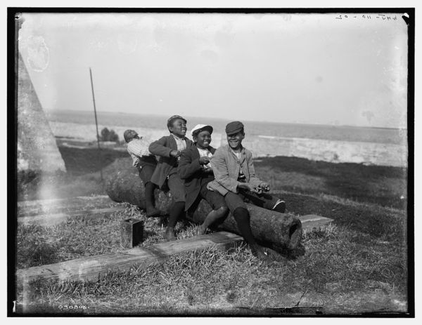 Four black boys sitting on a cannon by a waterfront