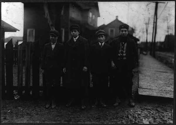 Four Breaker Boys working in #9 Breaker, Hughestown Borough. Boy on left is Tony Ross, 142 Panama Street, other small boy is Mike Rosa i.e., Ross?, cousin. Location: Pittston, Pennsylvania.