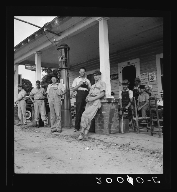 Rural filling station becomes community center and general grounds for loafing. The men in baseball suits are on a local team which will play a game nearby. The team is called the Cedargrove Team. Fourth of July, Near Chapel Hill, North Carolina
