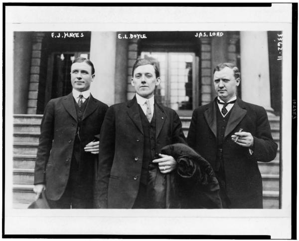 Frank J. Hayes, E.L. Doyle, Jas. Lord, three-quarter length portraits, facing front, standing outside building