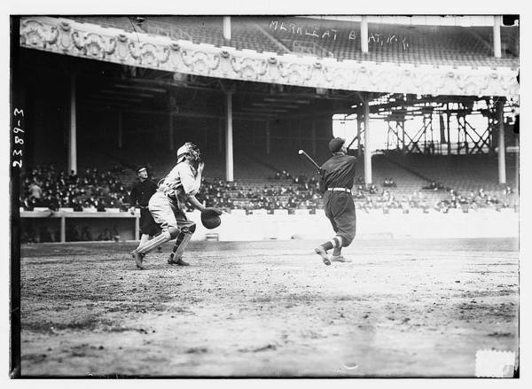 Fred Merkle (New York NL) at bat, Red Murray (New York NL) walking in background, and unidentified catcher at the Polo Grounds, NY, 1911 World Series (baseball)