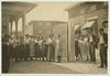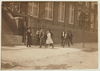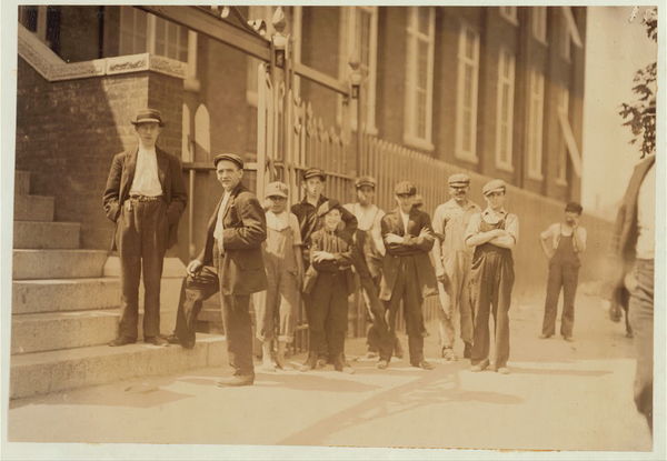 Group of workers going in at noon. Joe Viora, 9 Stapelton St., the smallest boy in the picture, works in the spinning room. Apparently 10 yrs. old.  Location: New Bedford, Massachusetts.