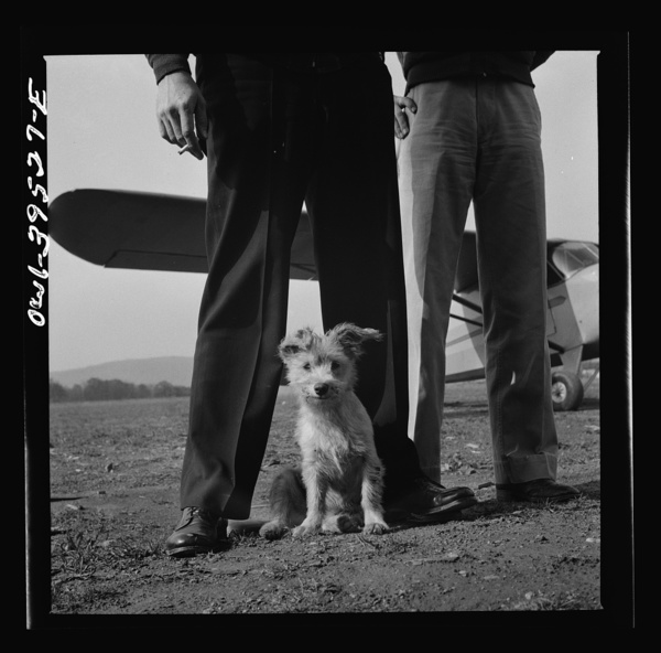 Frederick, Maryland. A student pilot removing burrs from Greaseball, a mascot at the Stevens Airport