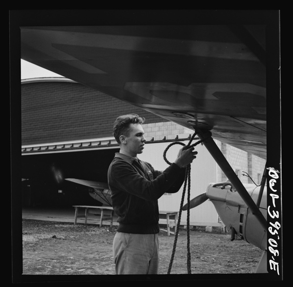 Frederick, Maryland. Returning from a practice flight at Stevens Airport, Walter Spangenberg, a student at Woodrow Wilson High School, ties down his plane