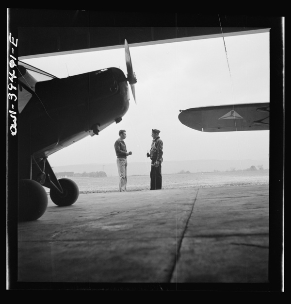 Frederick, Maryland. Walter Spangenberg, a student at Woodrow Wilson High School, talking to a friend at the Stevens Airport where he takes flying lessons