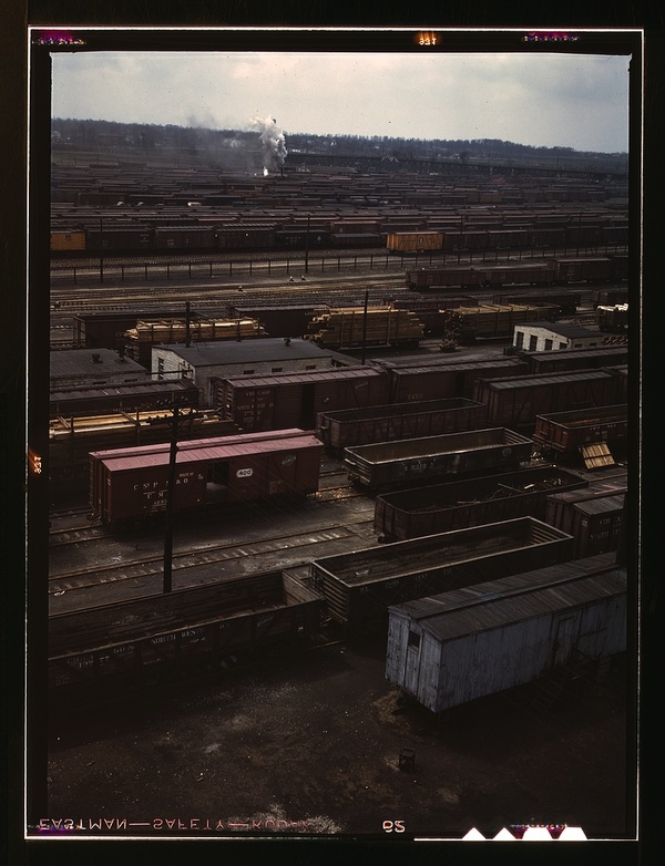 General view of part of the Proviso yard of the Chicago and Northwestern railroad, Chicago, Ill. In the background is the coal chute and roundhouse