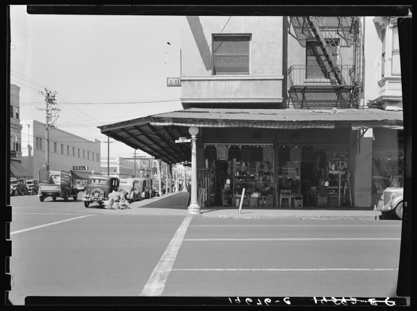 Fresno. Street corner of San Joaquin Valley town on U.S. 99 showing secondhand store. California