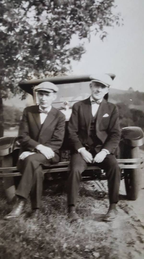 From Jane Hart Schmidt: "My Grandfather John Kurleff and his friend Christian Olsen sitting on the bumper of the car they bought together - about 1920 NY."