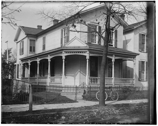 Front view of 7 Hawthorn Street, the Wright home, with bare trees and a bicycle resting by the right gate of the front fence, about 1900
