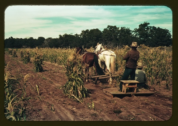 Jack Whinery and Jim Norris, homesteaders, looking at roots of stalk of corn, Pie Town, New Mexico