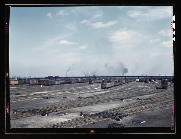General view of part of the Proviso yard of the Chicago and Northwestern railroad, Chicago, Ill. In the background is the coal chute and roundhouse