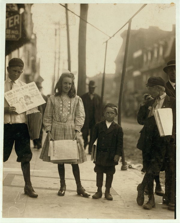 Girl and boys selling papers. Edward F. Brown, Investigator. Location: Wilmington, Delaware / Photo by Lewis W. Hine.