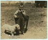Small boy standing outdoors with dog. Location: Oklahoma City, Oklahoma.