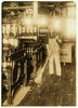 Boy holding broom near textile machinery Location: Fall River, Massachusetts.