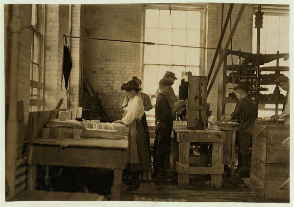 Girls, boys and men, polishing and wrapping, working together: morals in glass factory are proverbially bad. Union Stopper Co., Morgantown, W. Va. Several very young girls and many small boys working here. Location: Morgantown, West Virginia.